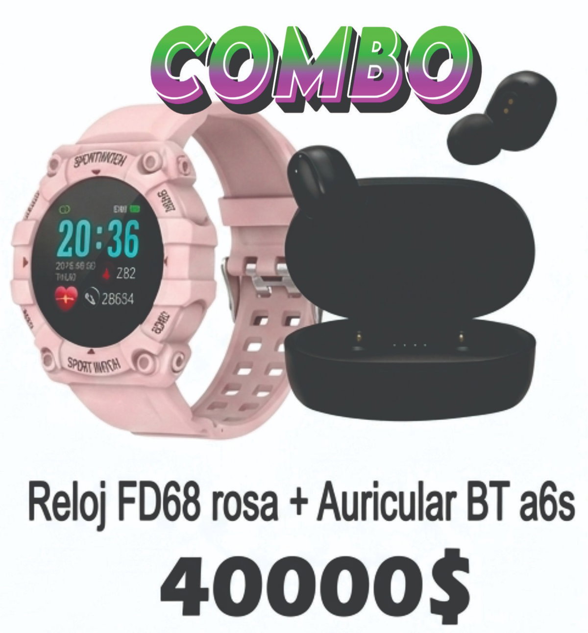 Combo Smartwacht Reloj Fd68 ROSA + Auri A6S NEGRO